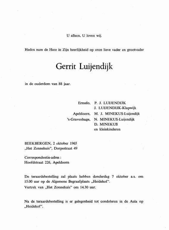 Gerrit overleed op 2-10-1965 te Apeldoorn (zie rouwkaart). Broers en zusters van Gerrit Luijendijk